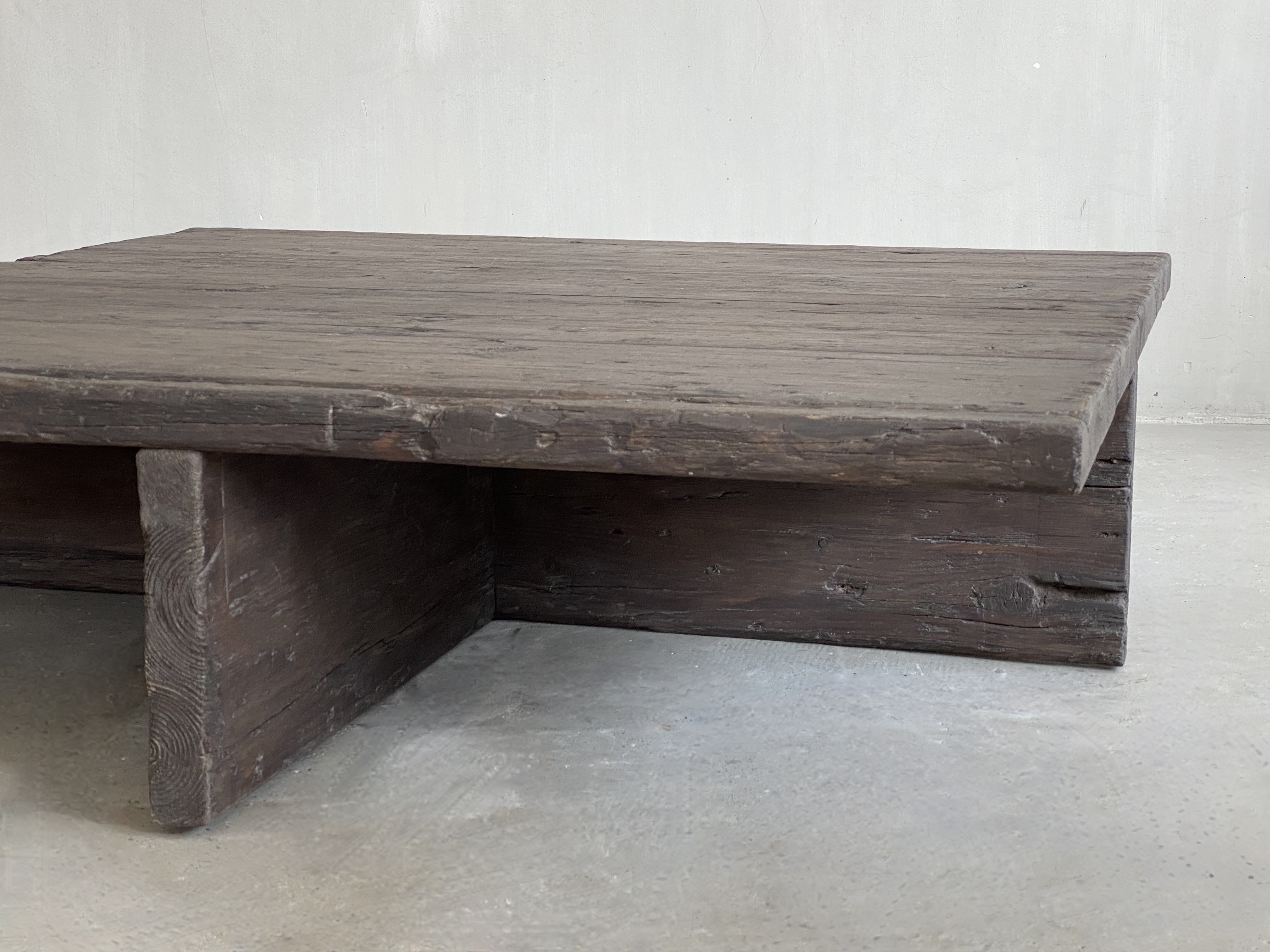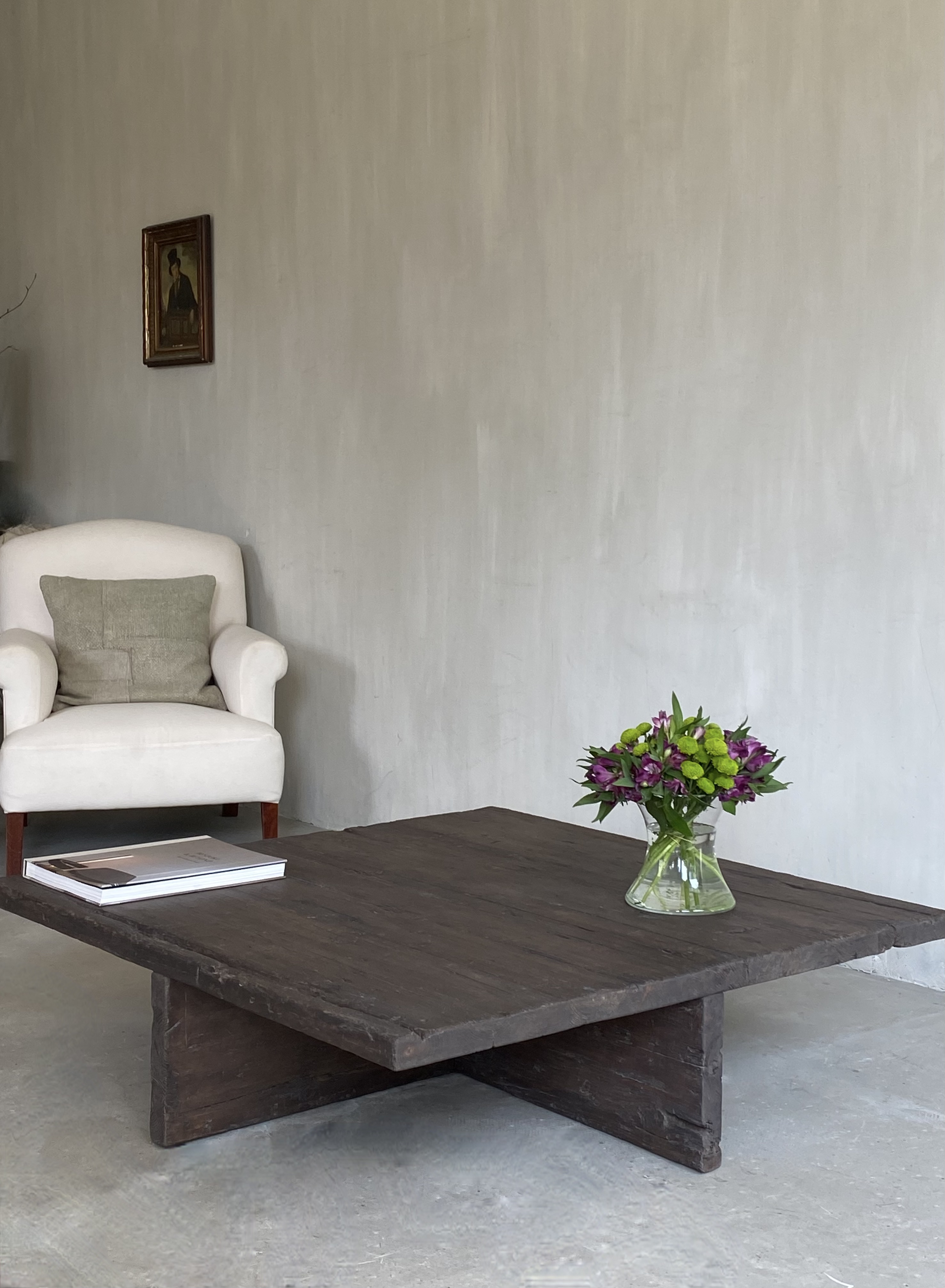 A square coffee table with cross base.
